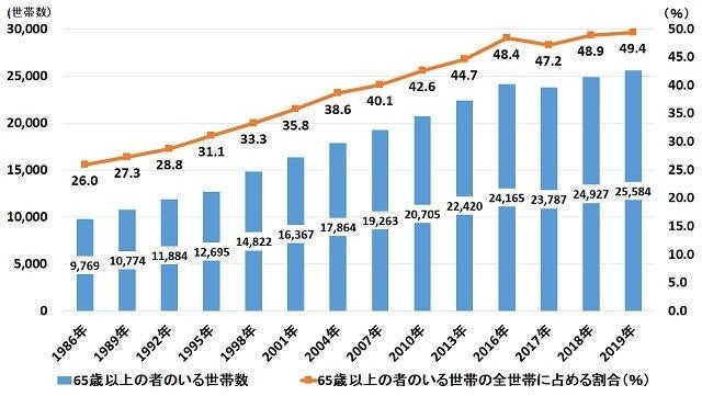 厚生労働省の「国民生活基礎調査」によれば、2019年6月の全国の世帯数は約5,179万件あり、65歳以上の人がいる世帯数は約2,558万件と、全世帯数の49.4%を占めています。そのうち、65歳以上の独居世帯は約737万件あり、今後も増加する見込みです。
