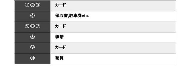 最大容量として、紙幣15枚、カード12枚、硬貨10枚、領収書等の収納ができます。また、コンパクトな財布やミニ財布の多くが、紙幣を完全に折って収納するタイプですが、紙幣を折り畳むことなく、そのまま収納することができます。
