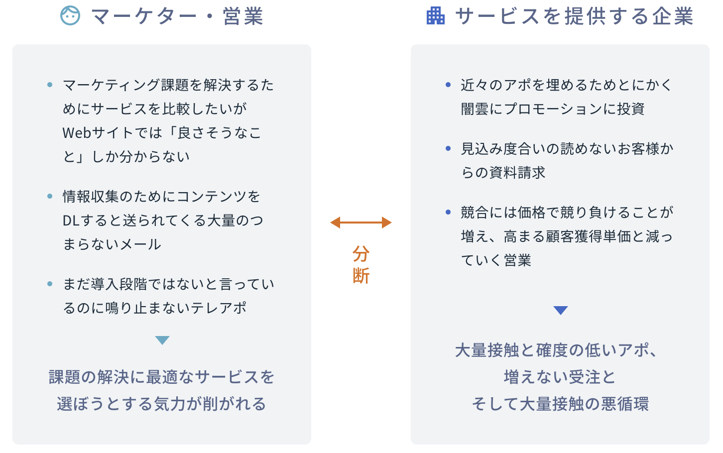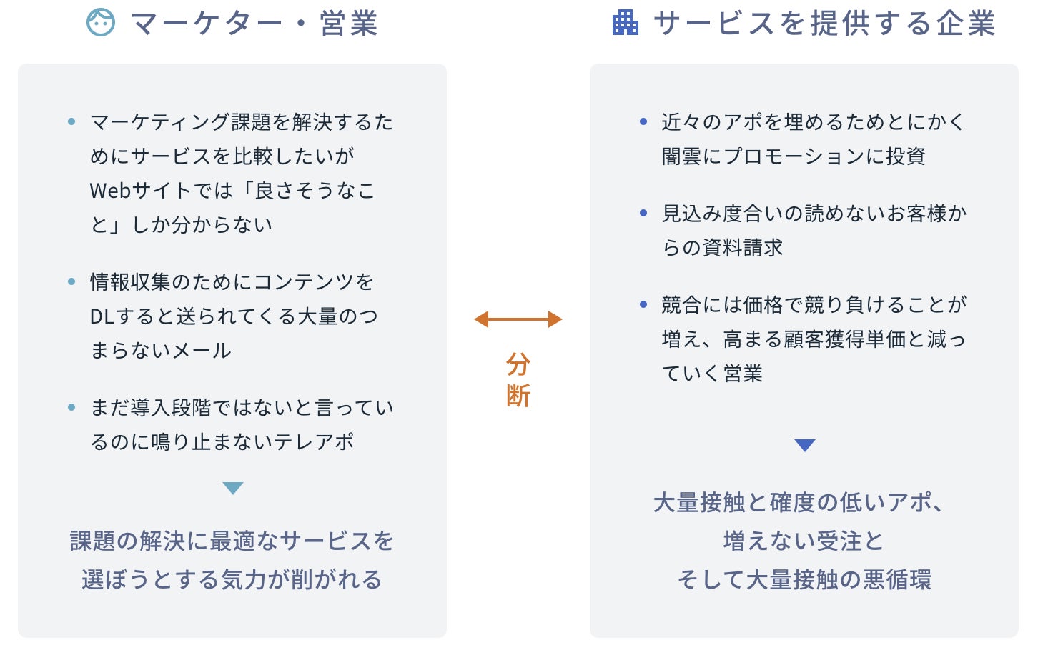 例えばマーケティングサービスを例にしても、買い手である「マーケター・営業」が最適なサービスを選定しづらく気力が削がれる現状と、売り手である「サービスを提供する企業」では、顧客との接点は高まるものの受注が増えない悪循環、というような分断があります。