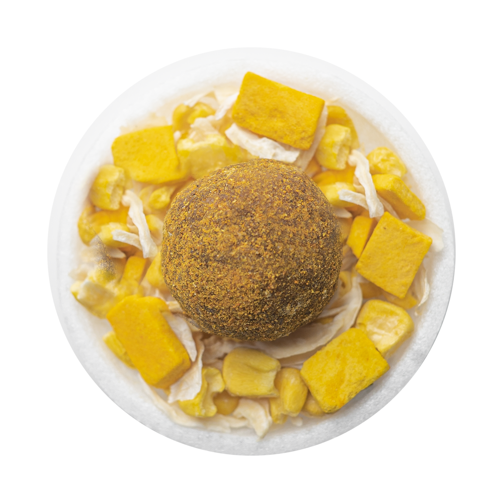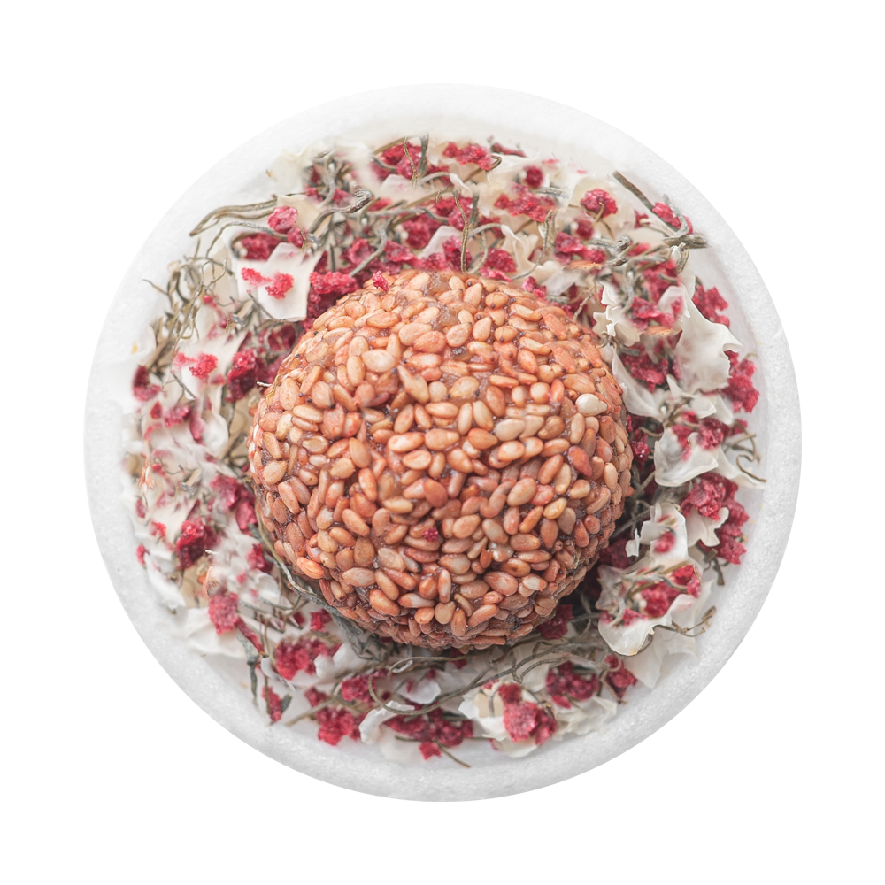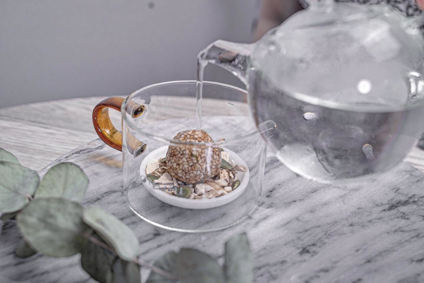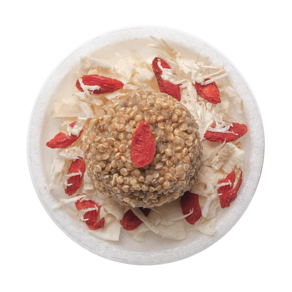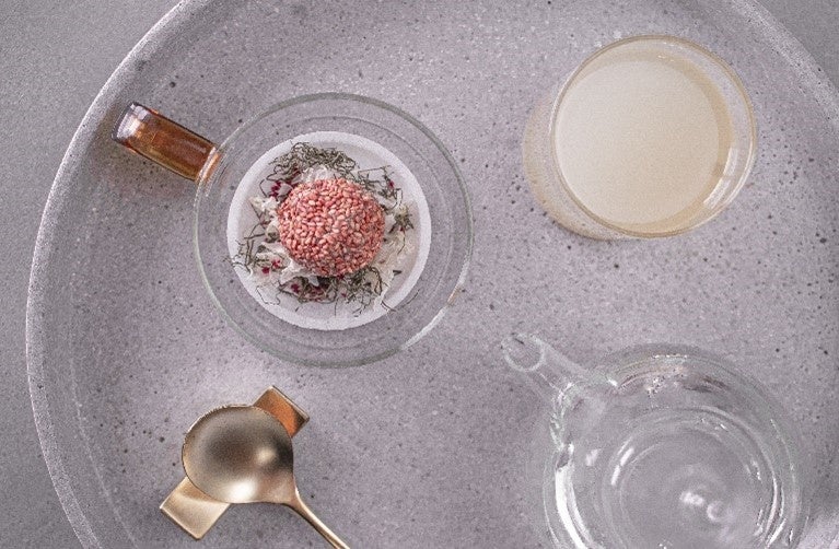 自然の甘みが優しい麦みそに野菜ブイヨン、あごだしをブレンド。透き通るような色と甘味がやさしいスープです。「色」からインスピレーションを得た具材を散りばめました。