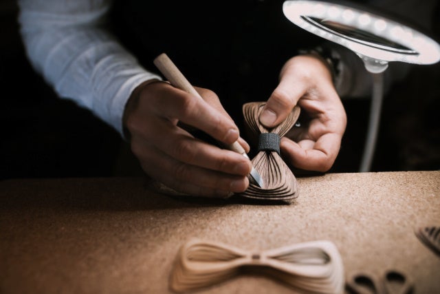 商品には、森を守るFSC認証を得ている「余剰木材」を使用。木材加工会社で切り落とされた上質な木材を取り寄せ、当社アトリエでスタイリッシュな蝶ネクタイに変身させています。また、蝶ネクタイ中心部の生地には、オーダーメイド・スーツの紳士服専門店から取り寄せた上質な「余剰生地」を使用。スーツを作る際に切り取られた生地をアップサイクルしています。