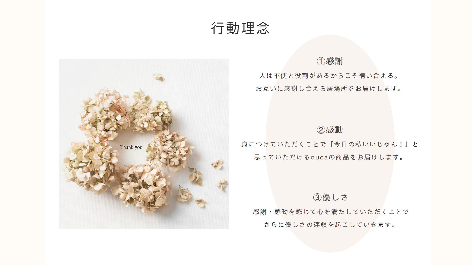oucaは「感謝・感動・優しさ」という行動理念を掲げています。この思いに添って、誰もがありのままの自分で人生をouca(謳歌)できる社会を目指しています!