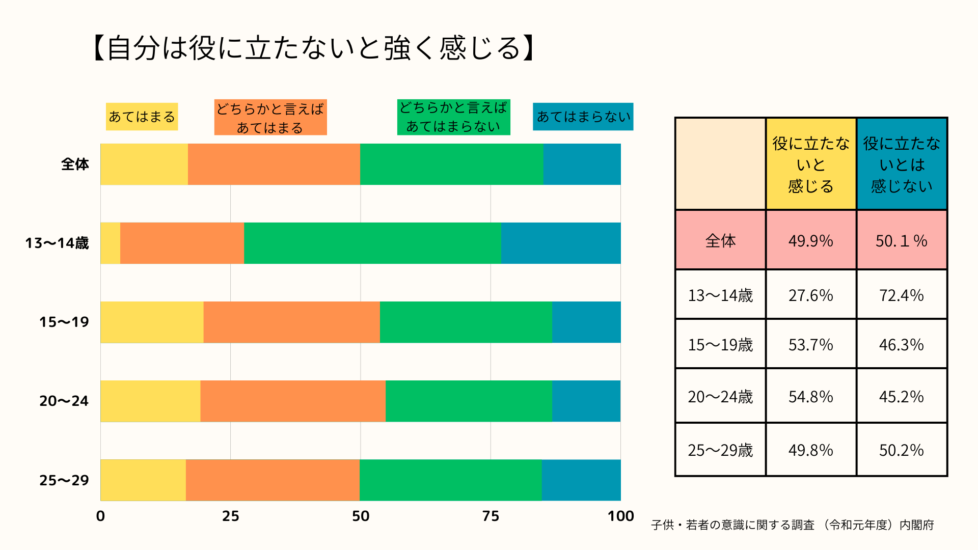 内閣府が実施した令和元年度の「子共・若者の意識に関する調査」で「自分は役に立たないと感じるか」という質問があります。その質問に対してなんと、2人に1人が「あてはまる」と答えているのです。