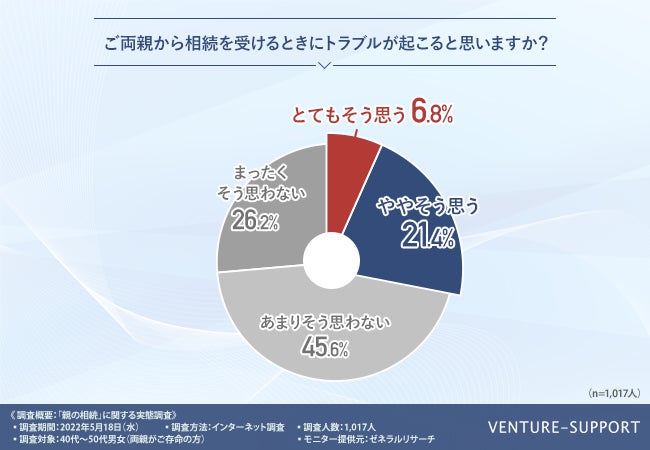 「ご両親から相続を受けるときにトラブルが起こると思いますか?」と質問したところ、約3割がそう思う(とてもそう思う6.8%、ややそう思う21.4%)と回答。