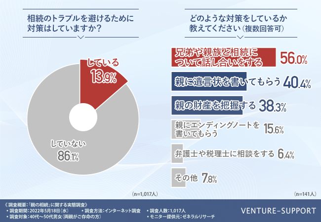 結果、半数以上が「兄弟や親族と相続について話し合いをする」と回答。他にも「親に遺言状を書いてもらう」が4割、「親の財産を把握する」などが挙げられた。