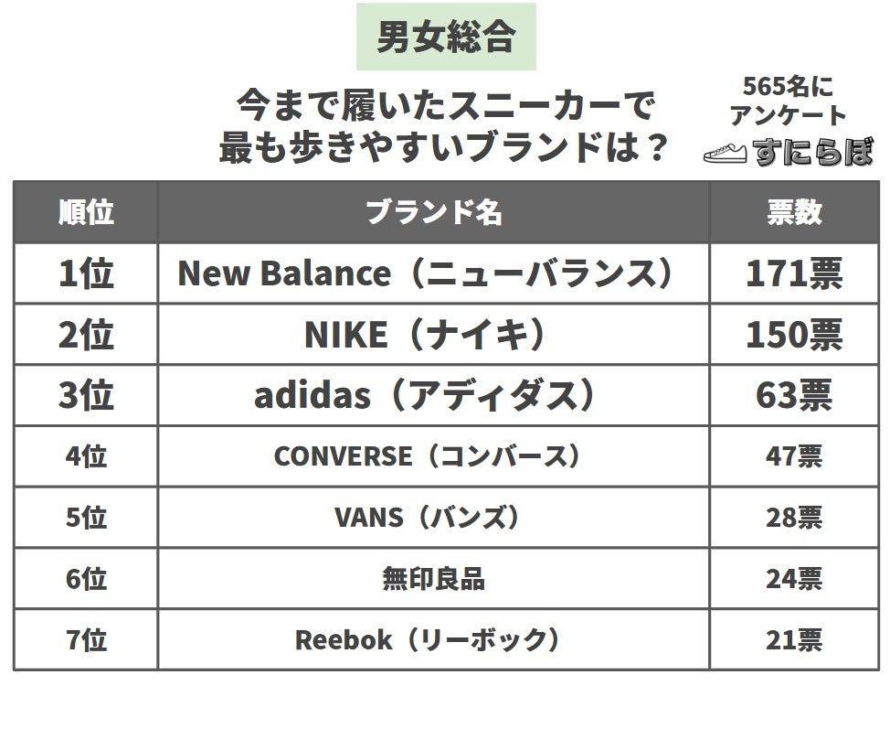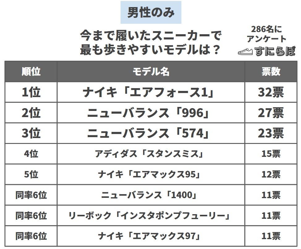 男女565名に最も歩きやすいスニーカーを伺ったところ、一番多かったのはニューバランスの「996」で56票、次にナイキの「エアフォース1」で50票と、特に2つのモデルの評価が高いことがわかりました。3位は同率で、ニューバランスの「574」、アディダスの「スタンスミス」で34票という結果に。