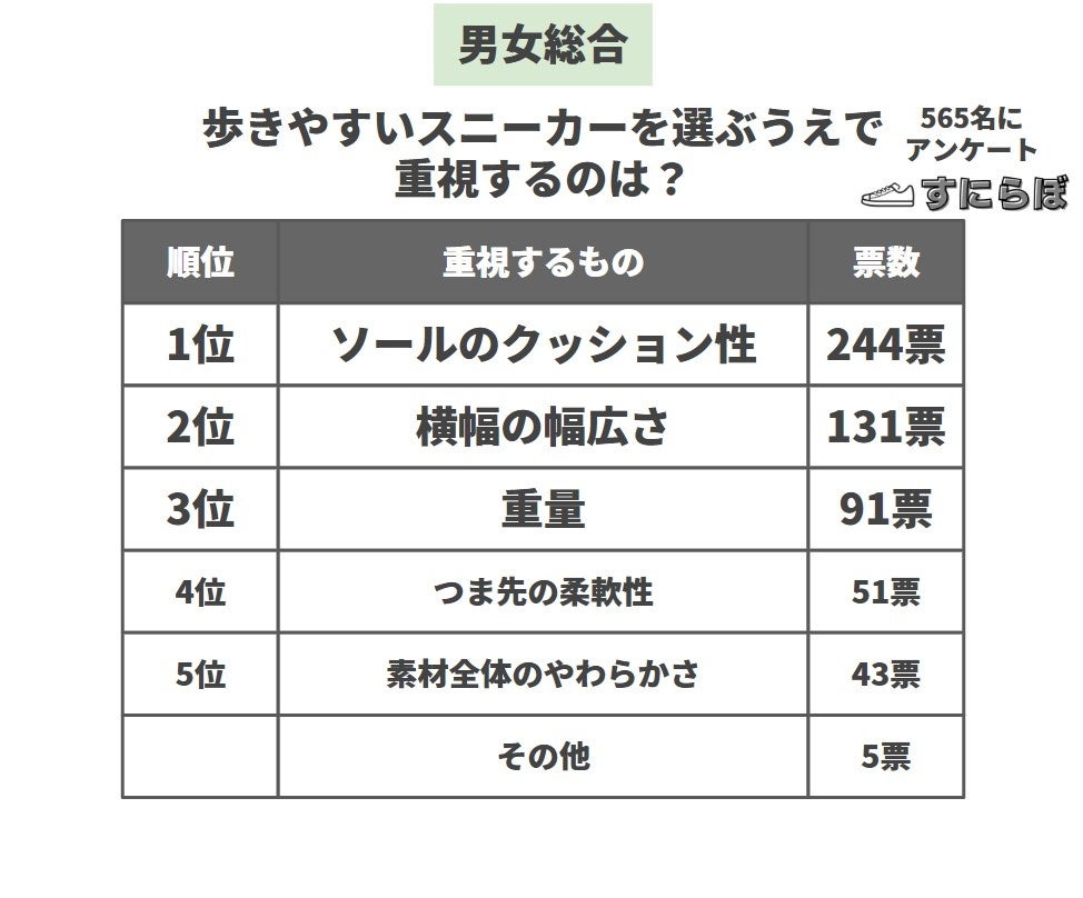 スニーカー専門メディア「すにらぼ」(https://sneakers-labo.com/)は、スニーカーを5足以上持っている男女565名に対して、歩きやすいスニーカーについてのアンケート調査を実施しました。その結果を公表します。