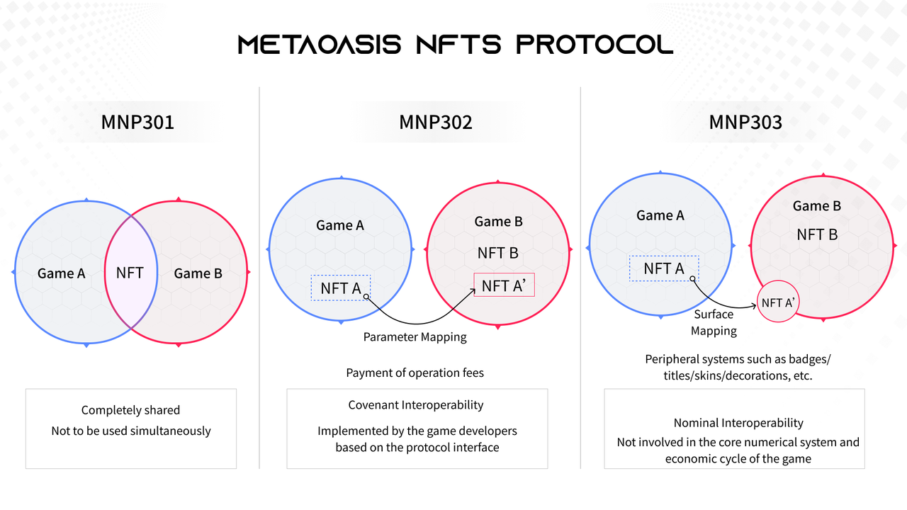 MetaOasisは、さまざまなgamefi NFTが、業界向けに適切に設計されたソリューションMNP30(MetaOasis NFTs Protocol、下図)を使用して、相互運用できないという状況を変えました。 一言で言えば、プラットフォーム内の異なるゲームでユーザーが持っているNFTやその他の成果を蓄積し、相互接続を実現するための一連の変換基準とプロトコルを構築することです。これは、ユーザーの重複投入のしきいをある程度下げ。 ユーザーが蓄積した価値をより持続可能にすることができます。