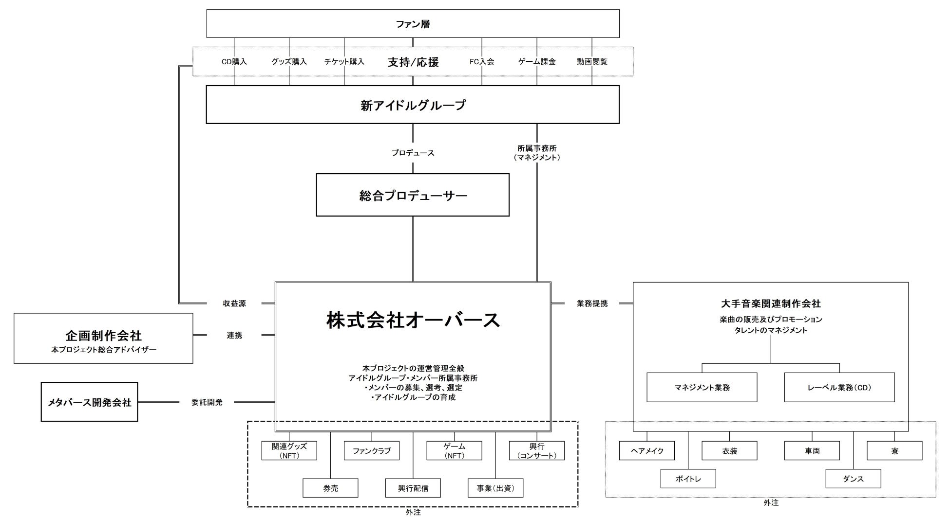 本プロジェクトにおいては、アイドルグループを、メンバーの募集から選考、選定及び育成まで、一から作り上げていきます。また、楽曲のリリース、コンサート、種々のイベントあるいはグッズの制作・販売などの従来のアイドル活動に加えて、NFT(ノン・ファンジブル・トークン)に代表されるブロックチェーン技術を活用したデジタルグッズの提供を行うとともに、メタバース内においては現実世界では実現できなかったアイドル活動を展開し世界中に発信していきます。加えて、既存のアイドルが直面している数々の課題への解決についても、本プロジェクトで実現していく予定です。