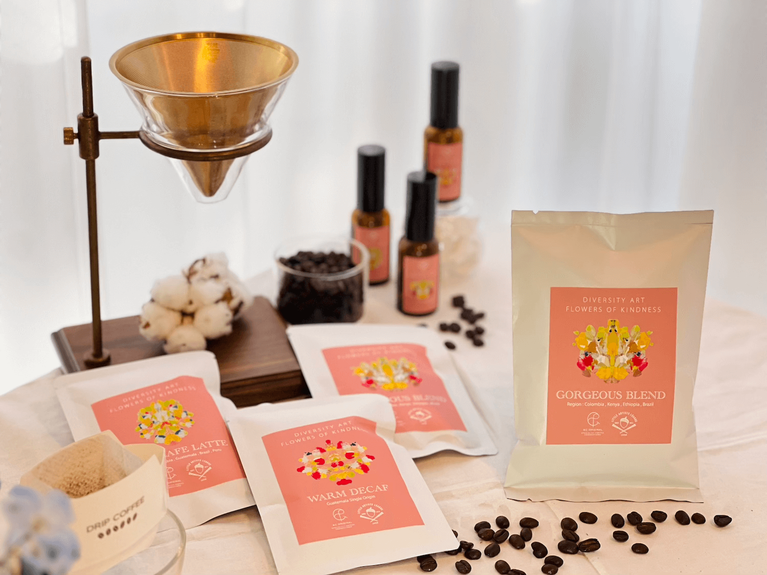 「やさしさの花」ラベルでスペシャリティーコーヒー3種を、「コーヒー豆」と「ドリップコーヒー」の2形態で展開を開始します。朝はコーヒーの香り、夜お休みの時はアロマの香りで、やさしさをお楽しみいただける特別なアロマスプレーセットもご用意しています。