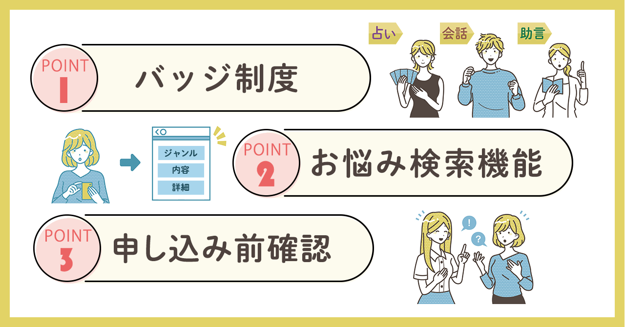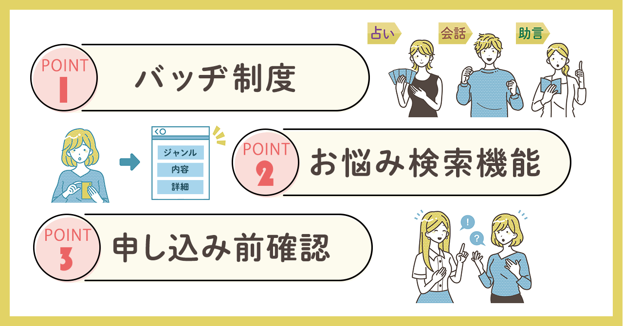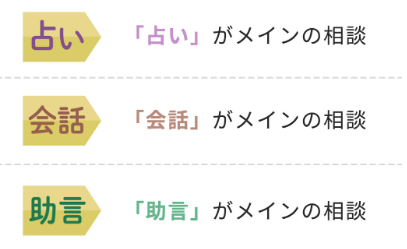 相談相手には「占い」「助言」「会話」3種類のバッヂが提示されているので、相談者の望む相談スタイルが簡単に見つかるようになっています。