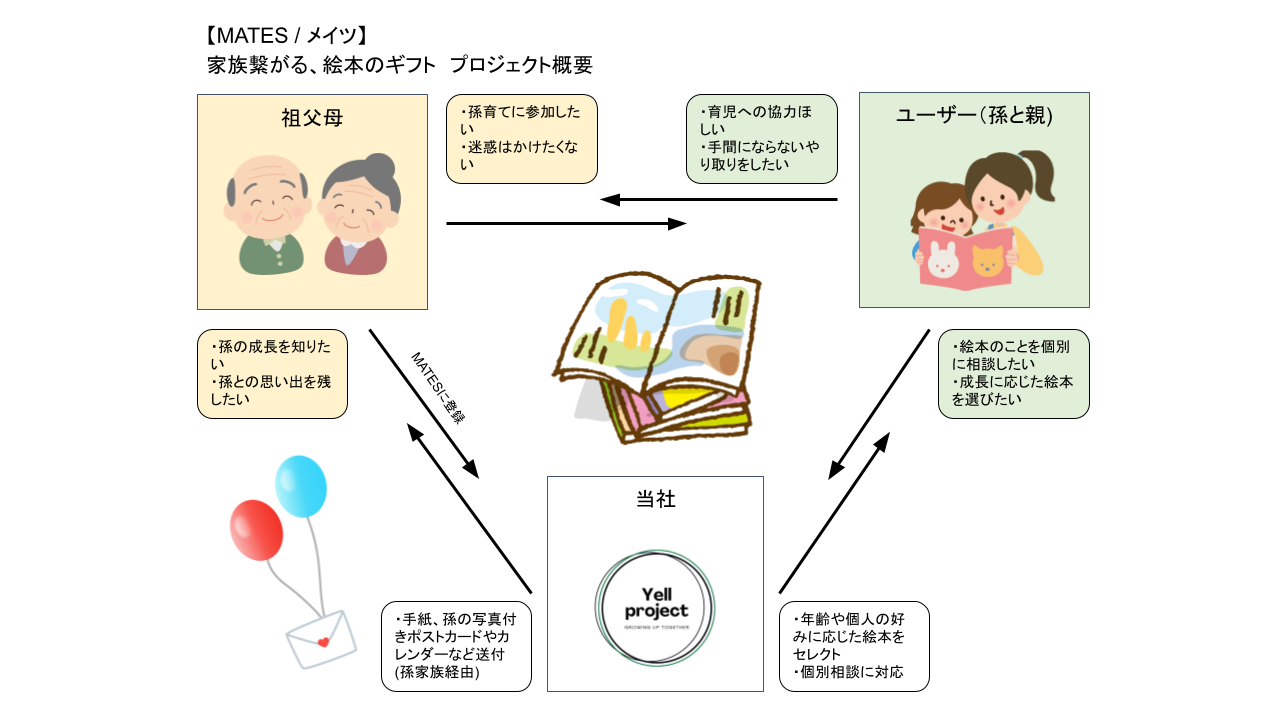 かつて大家族で暮らすのが普通だった頃、いつも孫を見守っていた祖父母の温かい目を、別の形で感じられるように、また、読書という人生の糧を積み重ねてもらえるように「家族つながる、絵本のギフト MATES」をスタートするに至りました。