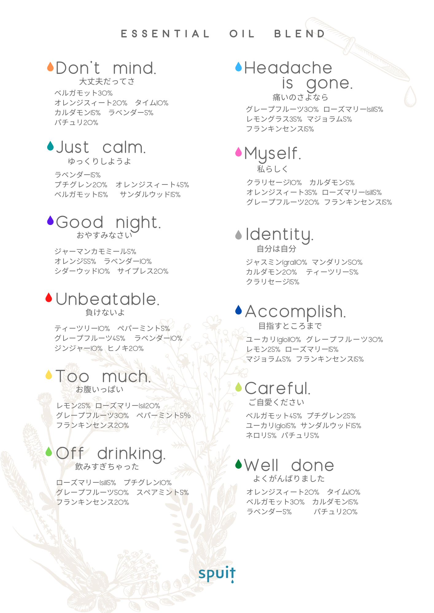 spuit(スポイト)の名前には、“日々のネガティブを吸取る”“生活にポジティブな一滴を注ぐ”という想い、そしてエッセンシャルオイルを添加する際に使用する「スポイト」に由来します。