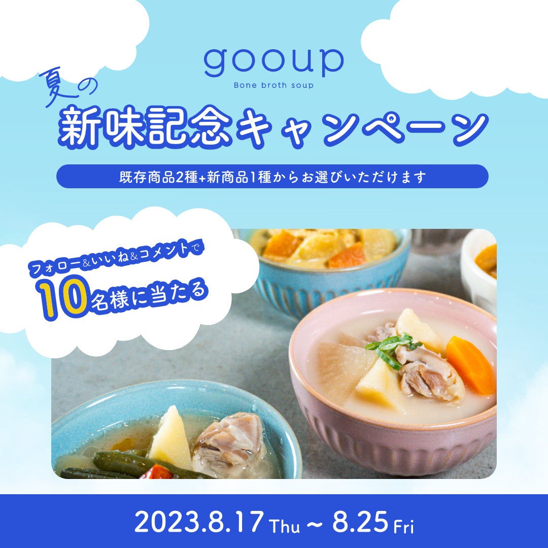 ボーンブロススープブランド「gooup」を展開するメーカー・株式会社10y(本社:大阪府大阪市中央区南本町2-4-8 ミズワンビル2F、代表:夏原 啓佑)は、2023年8月17日(木)より、新味追加記念を祝しまして、プレゼントキャンペーンを開始いたします。