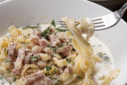 生のパンチェッタを炒め、そこからクリームとコンソメで旨味を煮出し、卵とグラナパダーノを混ぜ合わせたパンとも組み合わせぴったりのカルボナーラです。
