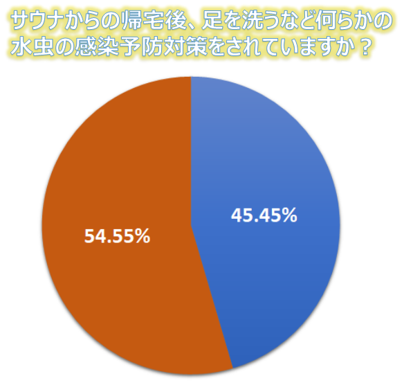 サウナからの帰宅後、足を洗うなど何らかの水虫の感染予防対策をされていますか?という質問に対して“はい”(している)と答えた人は45%、“いいえ“(していない)と答えた人は55%という結果でした。このことから全体の半数以上が、サウナ後の水虫対策をしていない実情がわかりました。