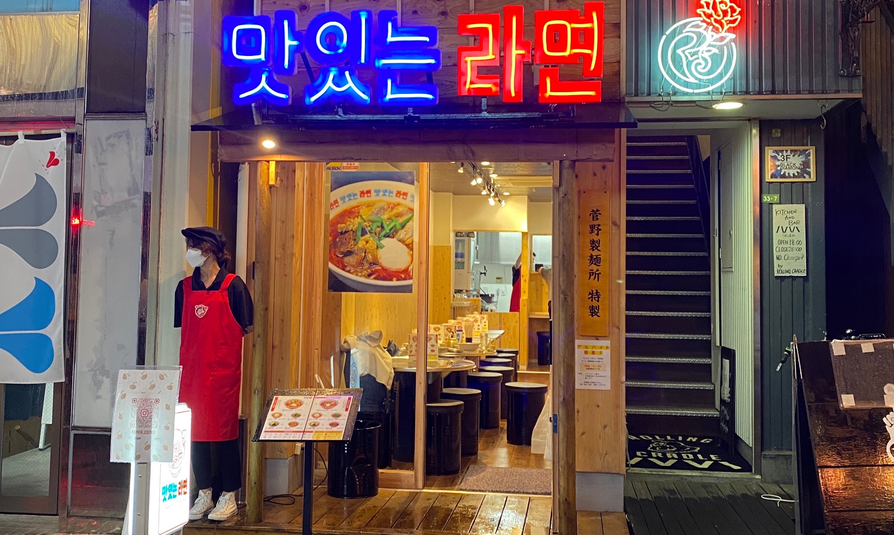 韓国風のネオンサインが光る外観