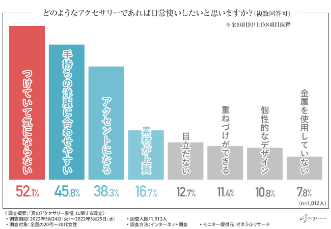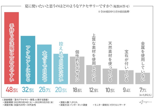 夏のアクセサリーは洋服に合わせやすいものが人気!20代~30代の約半数が支持