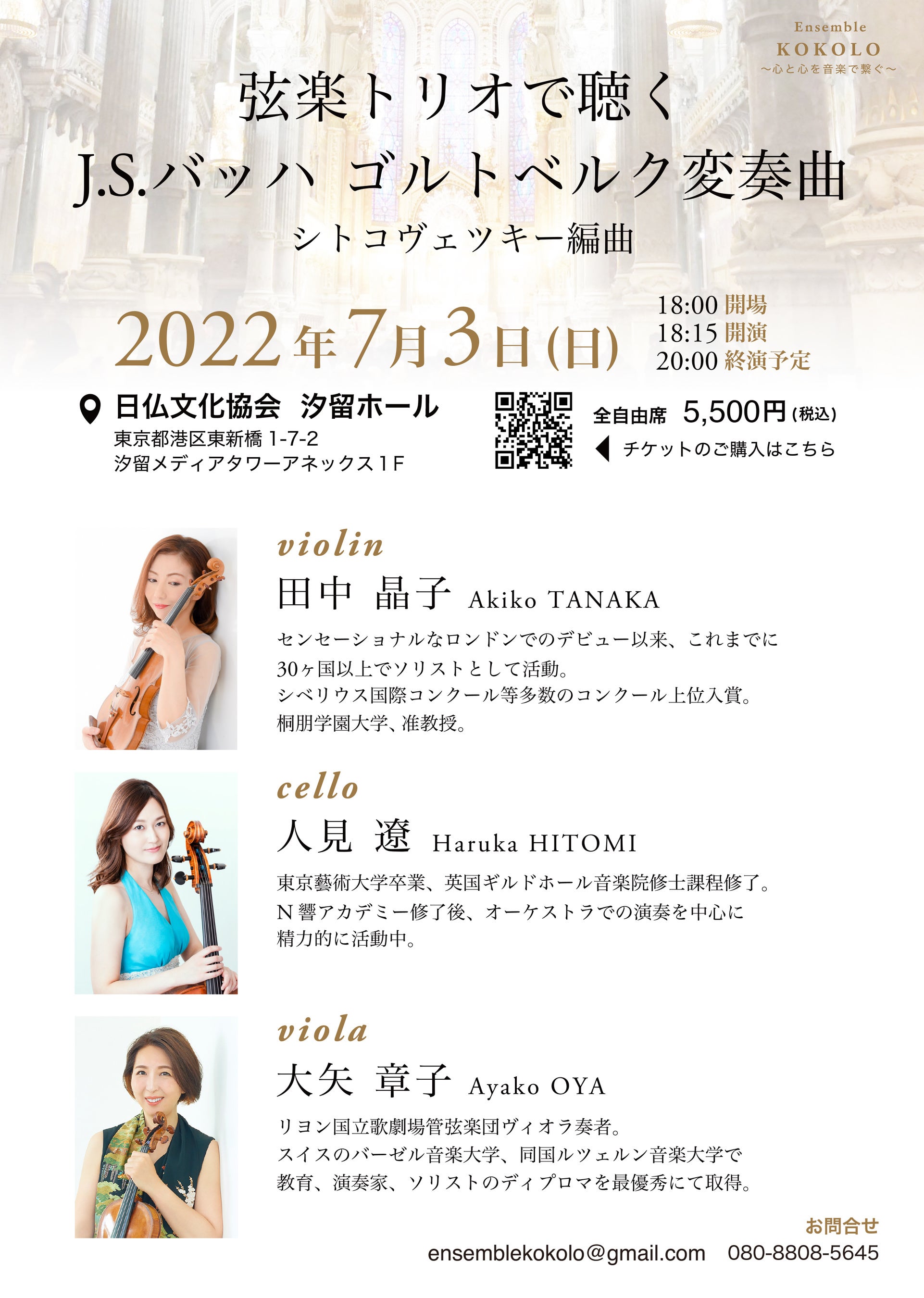 今回記念すべき第一弾となるイベントタイトルは『弦楽トリオで聴くJ.S. バッハ ゴルトベルク変奏曲 シトコヴェツキー編曲 - 心と心を音楽で繋ぐ』です。