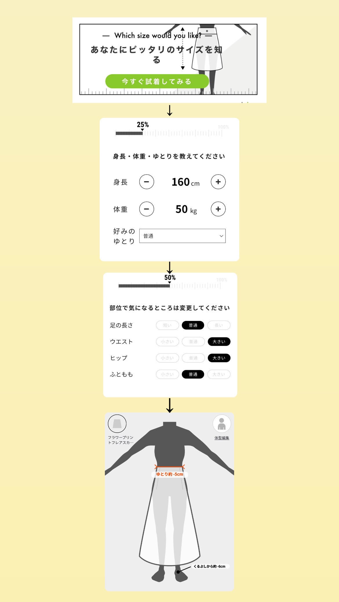 「ユニサイズ」は、1分程度の簡単なアンケートに入力するだけで人体データとの照合により身体のサイズを推測。最適なサイズを判定し、着用感をシルエットで表示します。ヌードサイズをメジャーで採寸し、登録する必要はありません。