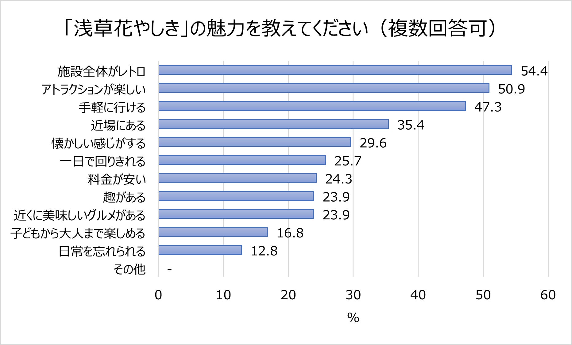 「浅草花やしき」に行ったことがある人に対して、魅力について質問しました。最も回答数が多かったのは「施設全体がレトロ(54.4%)」、続いて、「アトラクションが楽しい(50.9%)」「手軽に行ける(47.3%)」でした。また、約3割は「近場にある(35.4%)」「懐かしい感じがする(29.6%)」と回答。レトロや懐かしい、近場といった魅力は「浅草花やしき」ならではのものと言えそうです。