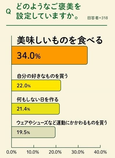 運動をつづけている人につづけるために設けているご褒美を尋ねたところ、「美味しいものを食べる(34.0%)」が最多、その他の回答として「自分の好きなものを買う(22.0%)」、「ウェアやシューズなど運動に関わるものを買う(19.5%)」が挙げられました。自分自身へのご褒美だけではなく、習慣化をさらに充実させるためのアイテムを購入する人もいる傾向があることが分かります。