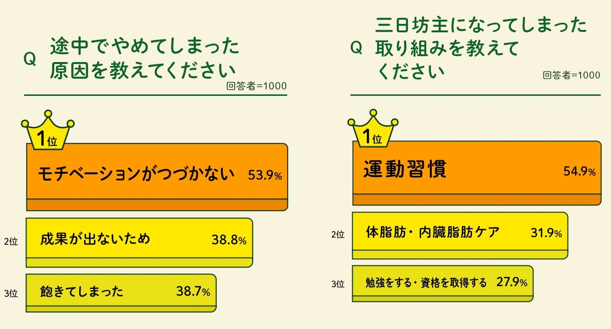 新しいことに取り組んで、三日坊主になってしまった経験がある人に途中で辞めた理由について尋ねたところ、「モチベーションがつづかない」が全体の53.9%で最多、次いで「思ったように成果が出なかった(38.8%)」「飽きてしまった(38.7%)」がつづく結果になりました。また、三日坊主になってしまった取り組みとして第1位が「運動習慣」が全体の54.9%、第2位が「体脂肪・内臓脂肪ケア(31.9%)」と回答。体や健康に関することが三日坊主になりやすい傾向があるようです。