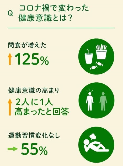 また、健康意識の変化については約2人に1人が「健康を気にするようになった(49.1%)」と回答しており、食事・間食の機会が増えたことで健康意識への高まりが垣間見えるものの、運動習慣などを通した改善への意識はあまり見られないことが分かりました。