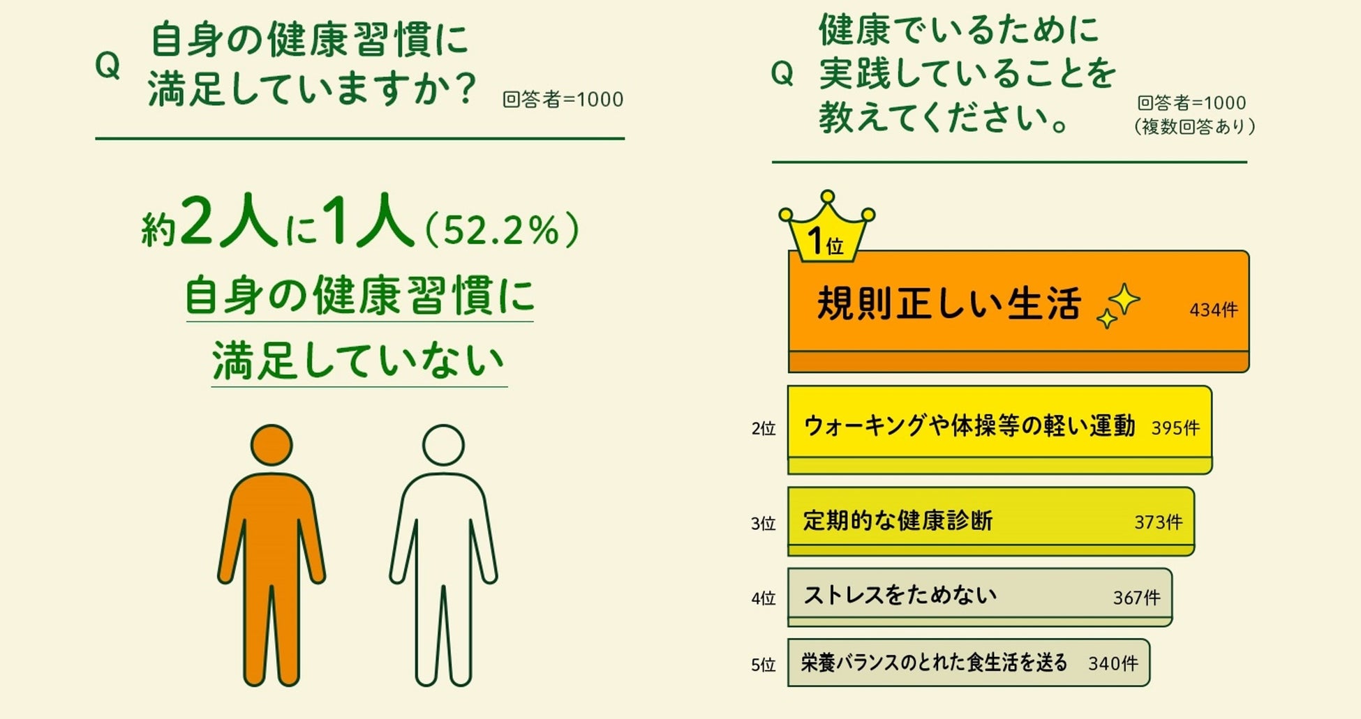 また、健康でいるために実践していることとして、「規則正しい生活」が434件で最多、次いで「ウォーキングや体操等の軽い運動(395件)」、「定期的な健康診断(373件)」という結果になりました。運動習慣よりも生活習慣を重視して実践している人が多い傾向にあることが明らかになりました。