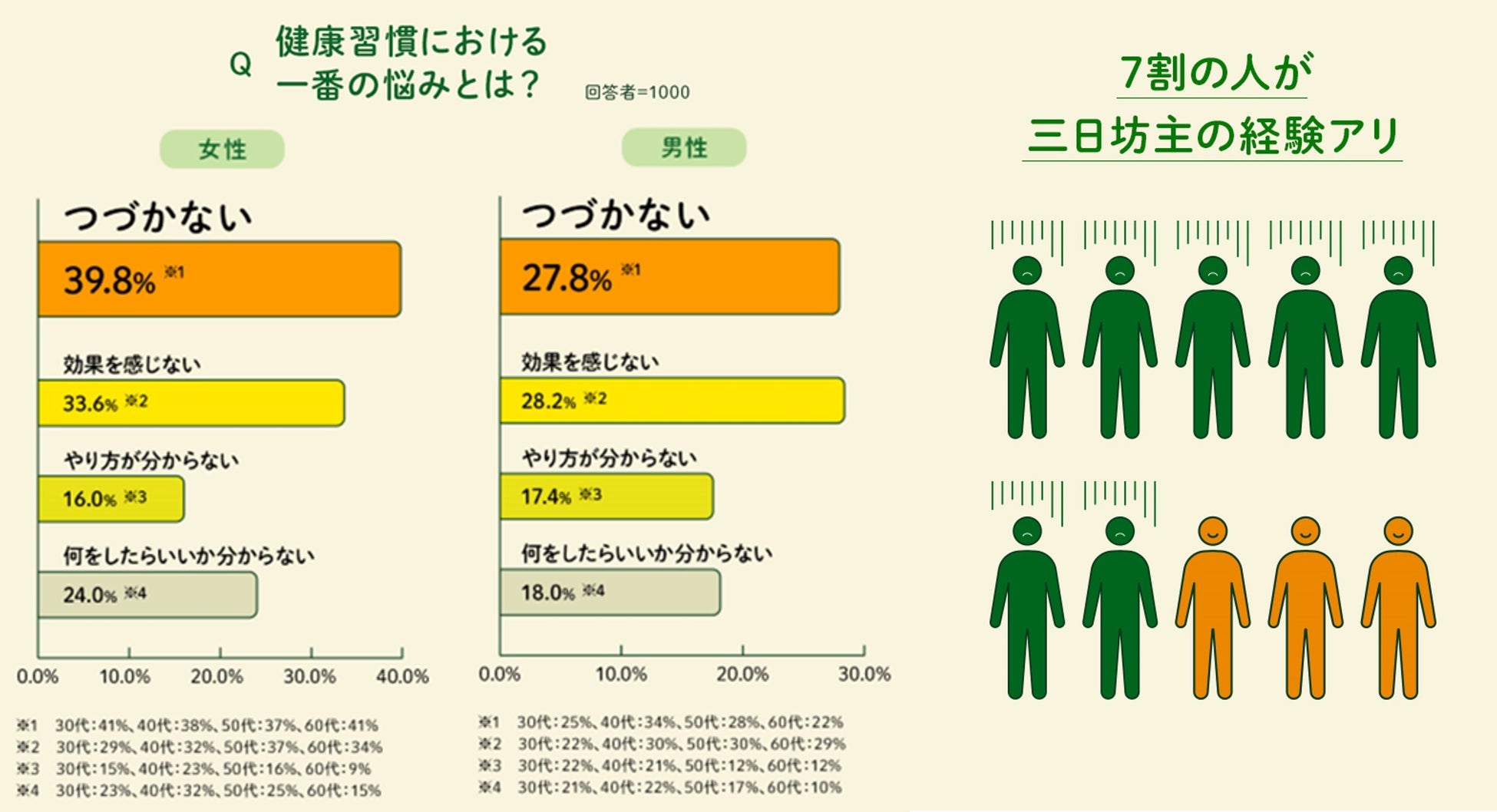 健康習慣における悩みでは「つづかない」と回答した人が女性では39.8%、男性では27.8%という結果に。男女計では約3人に1人が継続することへの課題を抱えていることが分かりました。また、全体の67.7%が「過去に新しいことに取り組んだが、三日坊主になってしまった経験がある」と回答しており、健康習慣は三日坊主になりやすい傾向があるようです。