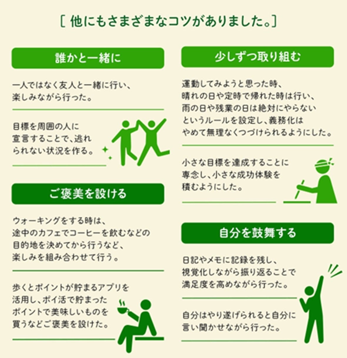 また、「歩くとポイントが貯まるアプリを活用し、ポイ活で貯まったポイントで美味しいものを買うなどご褒美を設けた」や「日記やメモに記録を残し、視覚化しながら振り返ることで満足度を高めながら行った」といった自分に対して働きかける取り組みも見られました。最初から大きな目標を立てるのではなく、身近なことから小さな目標を立てそれをコツコツと繰り返すことが成功の秘訣と言えそうです。