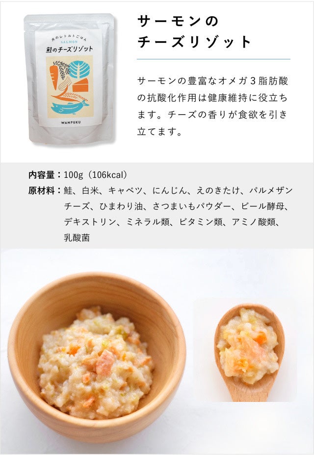 原材料|鮭、白米、キャベツ、にんじん、えのきたけ、パルメザンチーズ、ひまわり油、さつまいもパウダー、ビール酵母、デキストリン、ミネラル類、ビタミン類、アミノ酸類、乳酸菌
