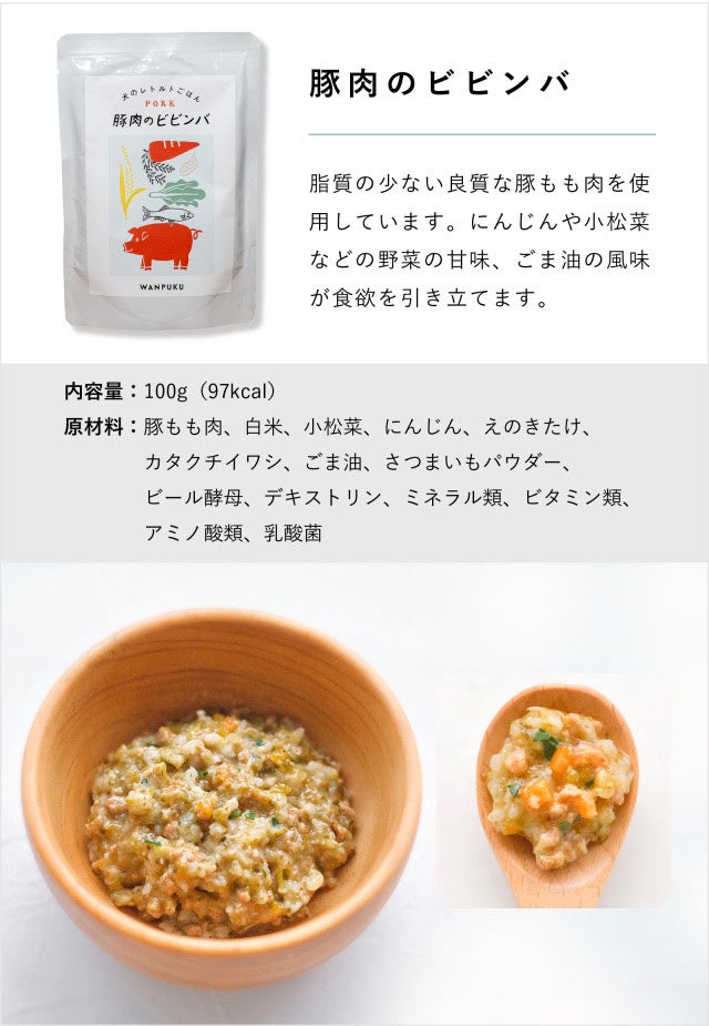 原材料|豚肉、白米、小松菜、にんじん、えのきたけ、カタクチイワシ、ごま油、さつまいもパウダー、ビール酵母、デキストリン、ミネラル類、ビタミン類、アミノ酸類、乳酸菌