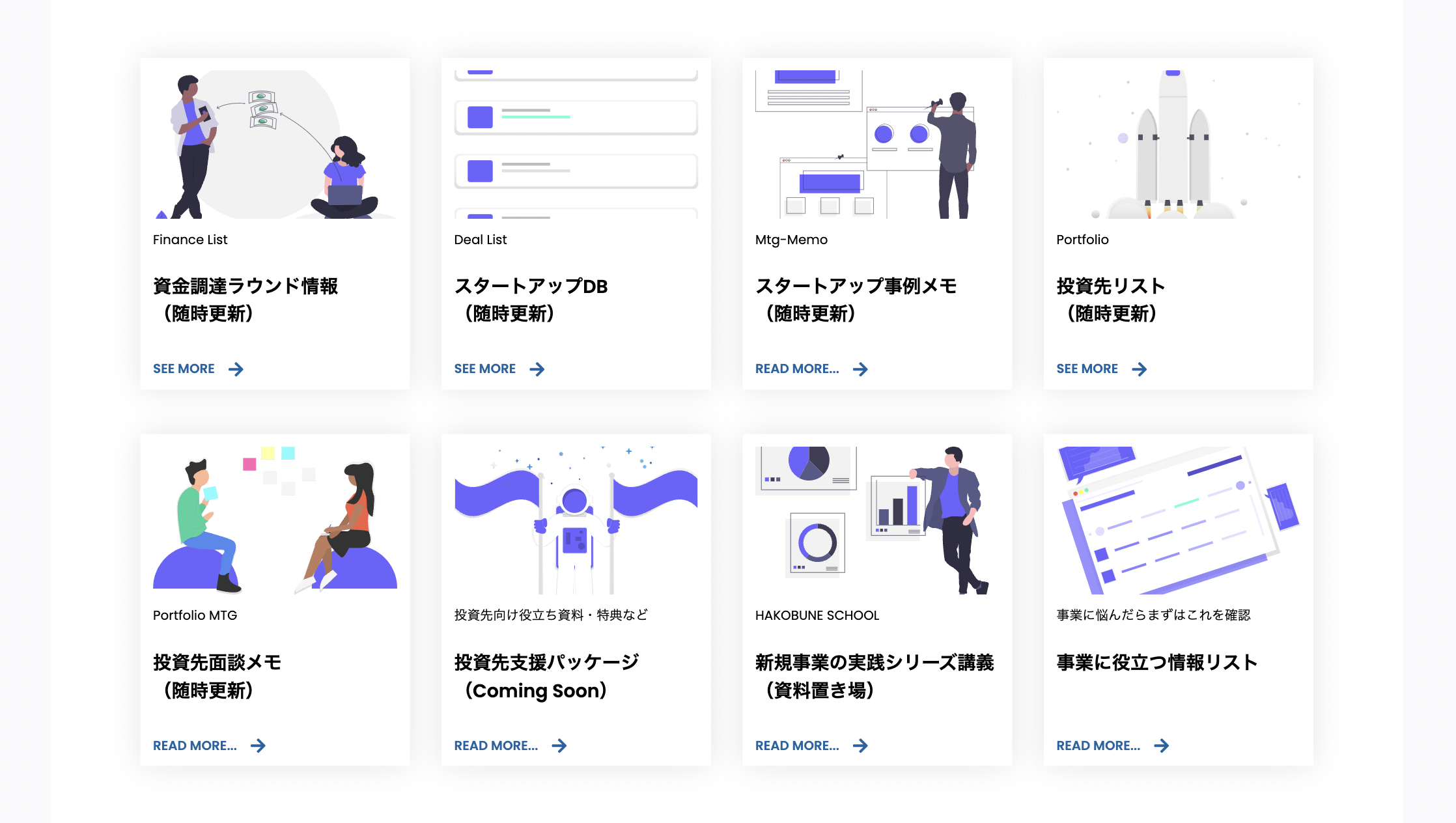 上記4つをベースとし、投資先スタートアップ向け情報ポータルを通じ、常に最新のスタートアップの資金調達情報、事例およびノウハウ情報を提供します。(以下、HAKOBUNE投資先向け情報ポータル内の画像)