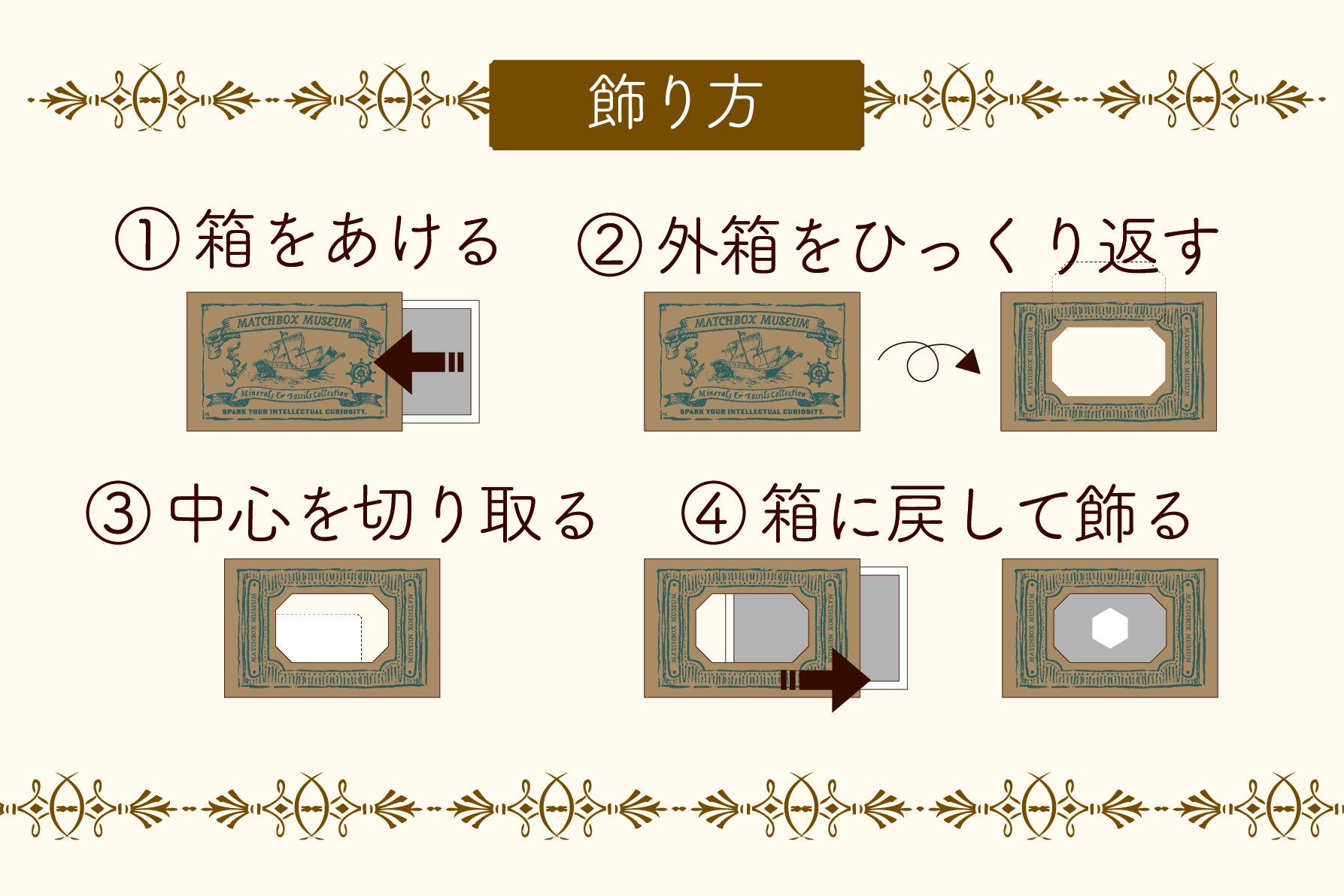 マッチ箱を開けて外箱の底にある小窓を外し、外箱の底を上にしたまま中箱を中に戻すことで、おうちでもそのままコレクションしていただけます。
