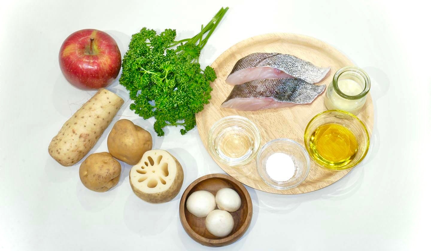 【使用食材】タラ・ジャガイモ・りんご・豆乳・長芋・レンコン・マッシュルーム・パセリ・オリーブ油・亜麻仁油・卵殻カルシウム