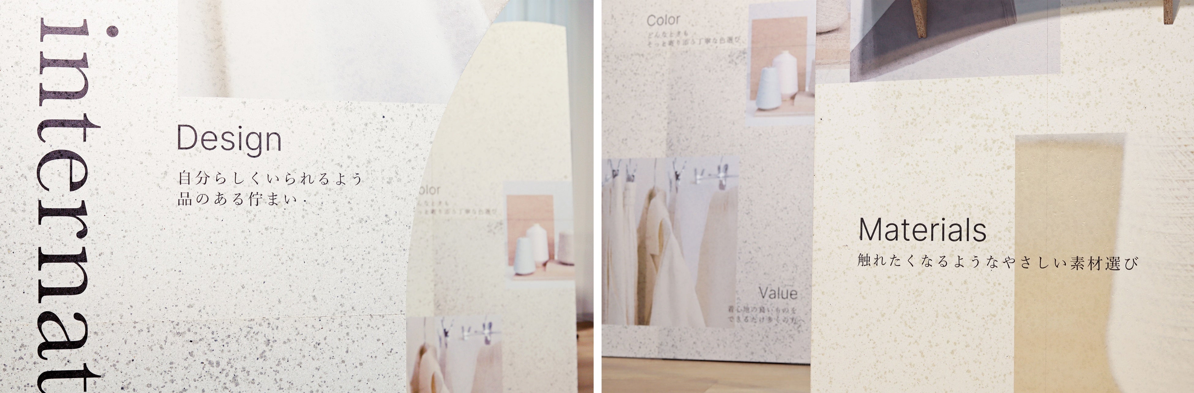 不要な衣料品をアップサイクルした繊維リサイクルボードPANECO®を採用。PANECO®は廃棄される様々な衣料品を分別せずに粉砕して成形しますが、今回はこの什器のために白い衣料品のみで成形。特注の白いPANECO®にヴィジュアルやブランドロゴを施し、美しさとサステナビリティを両立したパネル什器を実現しました。