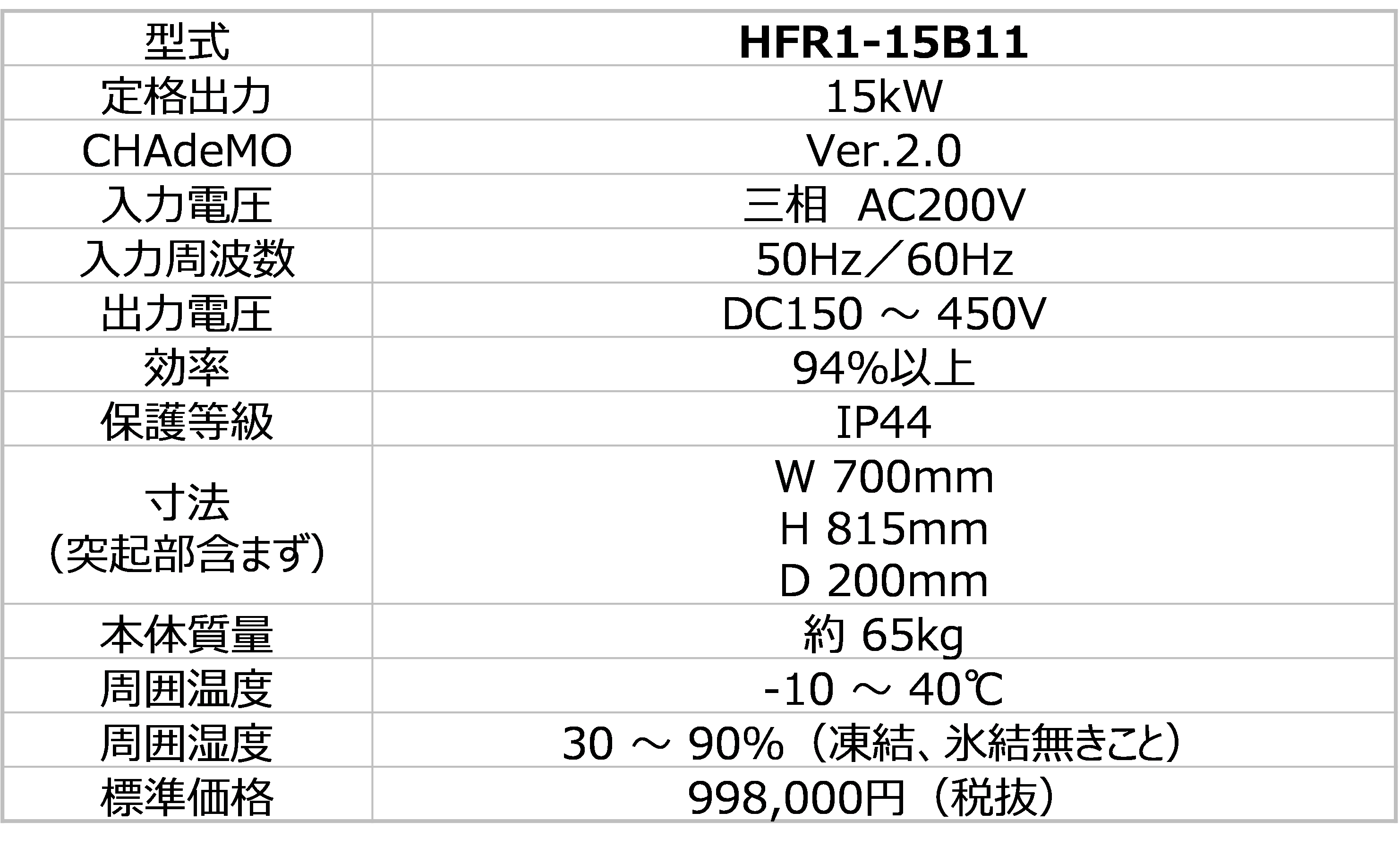 HFR1-15B11は、標準価格998,000円と従来の急速充電器に比べて、安価な価格を実現しました。 また、普通充電器が充電に8~12時間かかるのに対し、HFR1-15B11は2~3時間で充電が完了するので、価格帯と充電スピードのバランスが良い点が特長です。さらに、業界最薄の200㎜※を実現した、薄型壁掛けタイプとなっており、限られたスペースを有効活用していただけます。出力は最大15kWで、変換効率94%と、高効率を実現し、ケーブルサイズは22sqと細く、取り回し性に優れています。