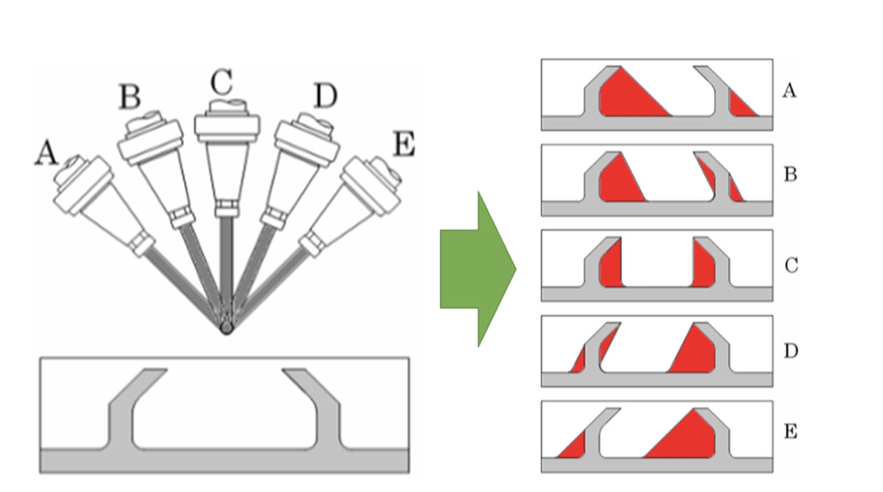 Virtual NC の「最適工具姿勢(角度)算出」機能を使えば、無限にある組合せの中から最適な工具の種類、工具突出し長、工具姿勢を見つけ出すことができます。工具の組合せは、先端種類(スクエア/ボールなど)、刃物(径、突出し長さ)、ホルダ(径、長さ)、工具(倒れ角、水平角)で指定します。