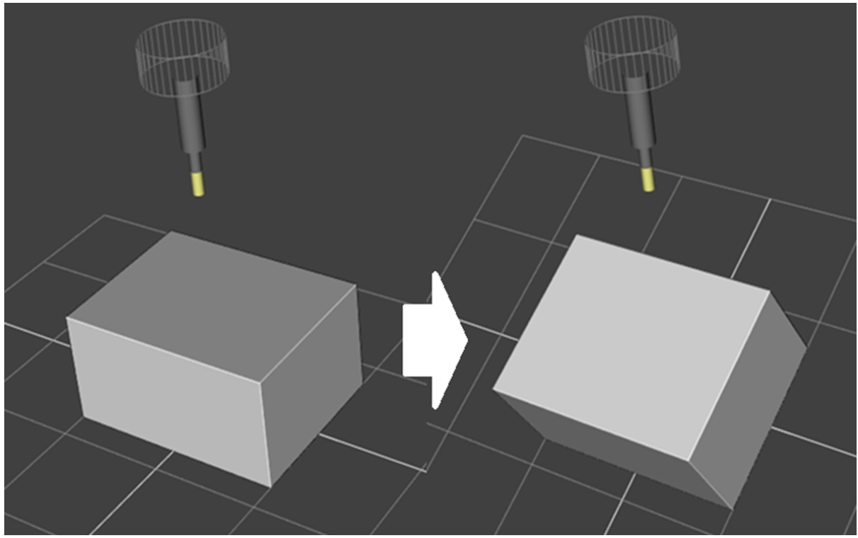 また、3軸加工機で素材を傾けて治具で固定して行う加工でも、NCプログラムを3軸加工で作成しておき、素材を上面・側面などの角度に設定し、工具をZ軸上方からアプローチする加工を再現できます。