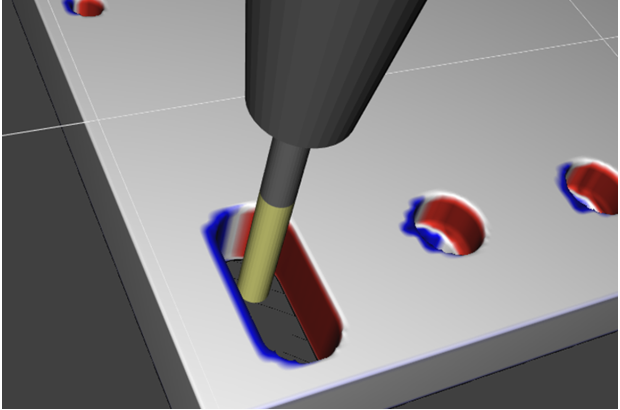 Virtual NCは、目的とする加工形状と素材の切削結果を重ね合わせて、削り込みを赤色、削り残しを青色で色分け表示することができます。NCプログラムの不具合、工具セット(刃物/ホルダの形状/サイズなど)の不具合、加工機パラメータ(補正量、ワーク座標系)の不具合などをスグに見つけ出すことができます。