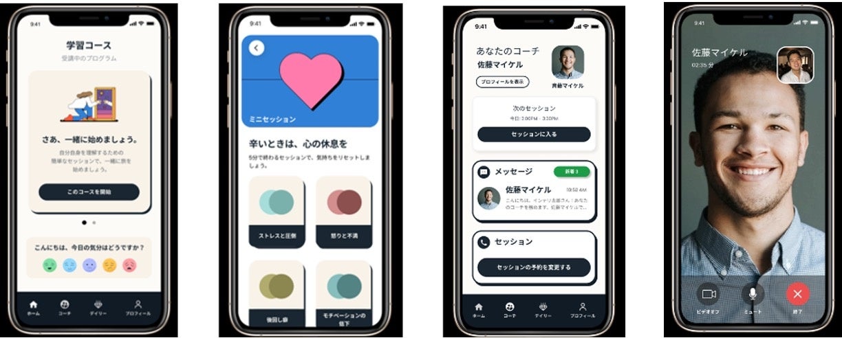 利用者は、「セルフケアプログラム」に加え、初期設定時で選択して頂いた利用者が抱える「悩み」や「解決したいメンタルヘルス課題」の解決に必要な「コーチング」をチャット及び、電話会議で24時間365日アクセスすることが可能です。また、コーチングを行うコーチ陣は、コーチングに関する専門的知識を有し、認定を得たコーチにより行われるほか、利用者は複数の認定コーチ陣の中から利用者に最も適したコーチを選択肢、コーチングを受けることが出来ます。