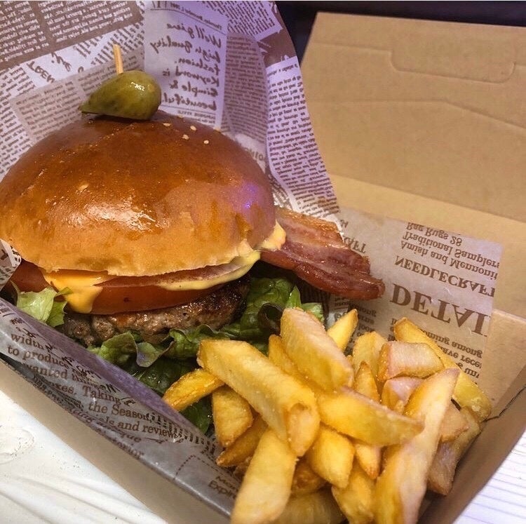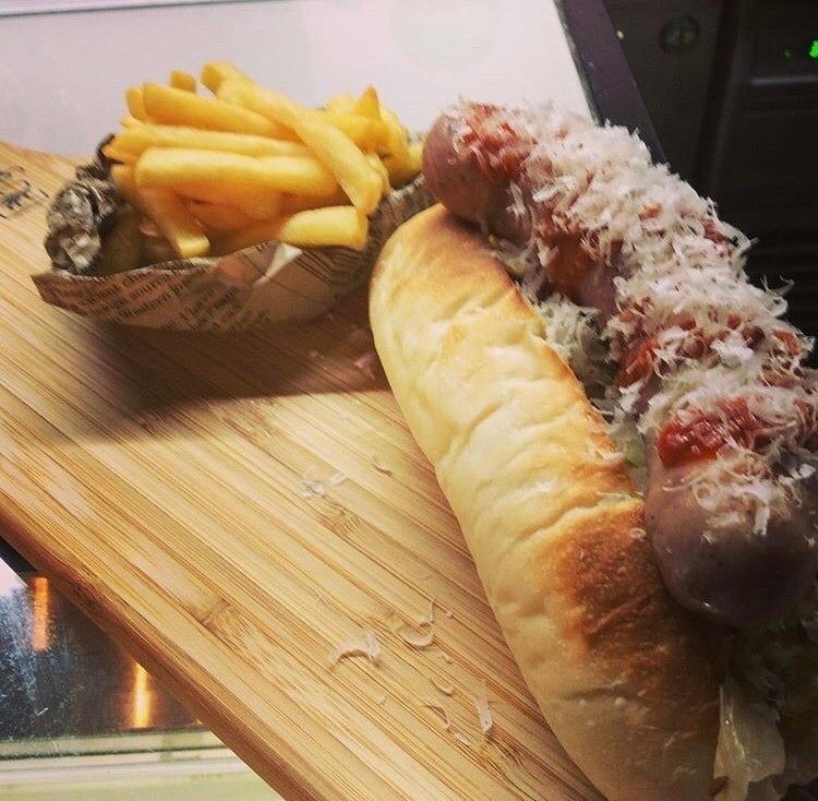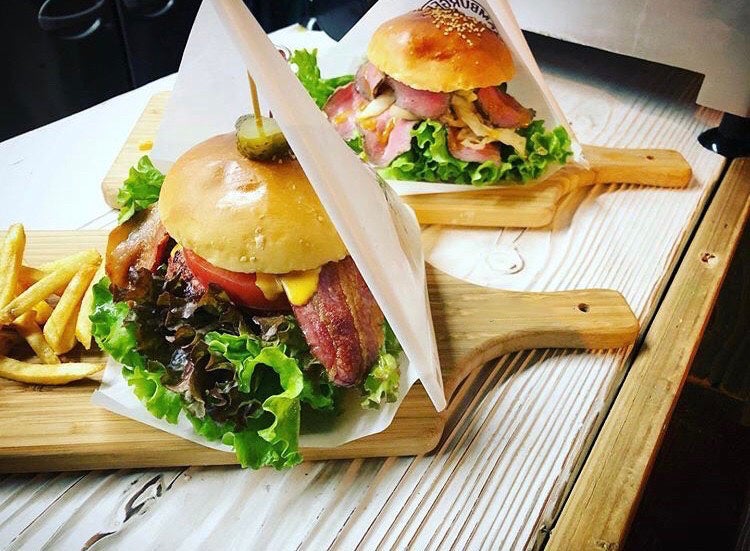 ・看板メニューの新感覚しらすバーガー(商品名:江の島 155バーガー))ソーセージ、ローストビーフ、生ハム、しらすサラダ、ジャークチキン)