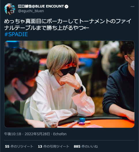 BLUE ENCOUNT の 江口雄也さんの他にも著名な方が決勝テーブルに進出されていました。