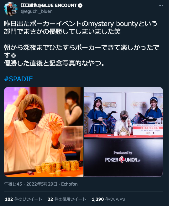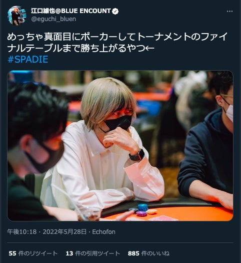 エモーショナルロックバンドの代表格 BLUE ENCOUNT の江口雄也さんがポーカー大会で優勝!!!(ご本人コメントあり)