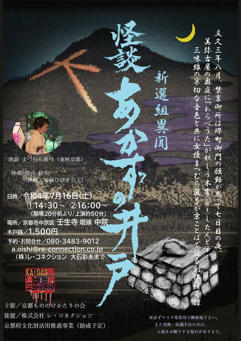 全国各地で怪談朗読公演を行う「京都もののけかたりの会」(代表:まつむら眞弓)は、2022年7月16日(土)に京ことばによる朗読公演【新選組異聞 -怪談- あかずの井戸】を上演致します。