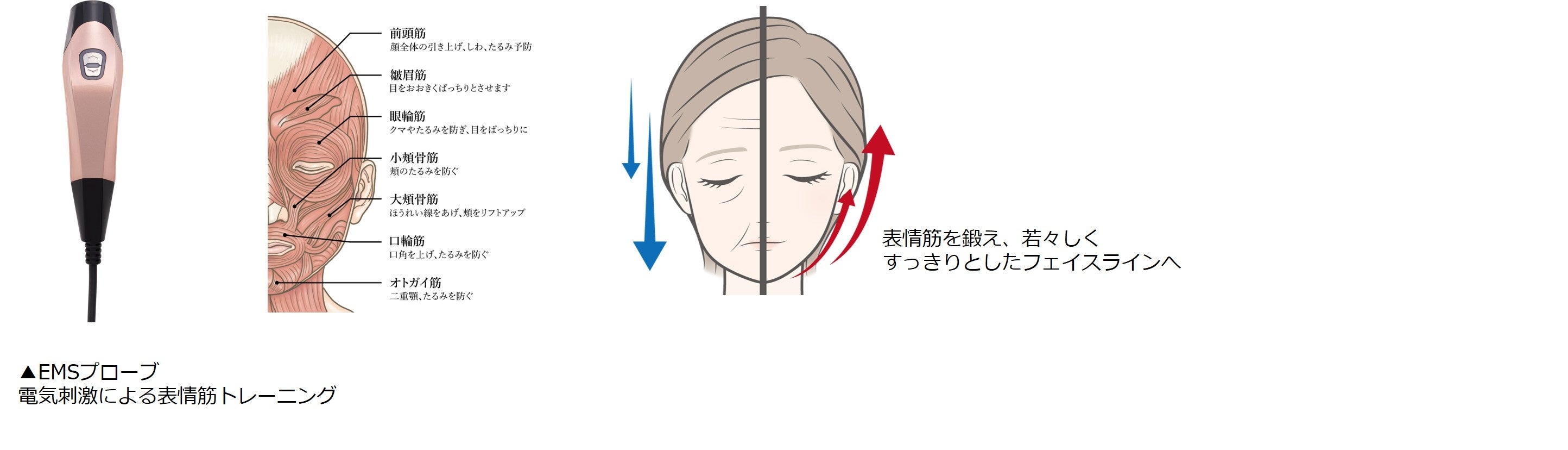 EMS機能は低周波で普段使わない顔のインナーマッスルに作用し、筋肉を引き上げます。