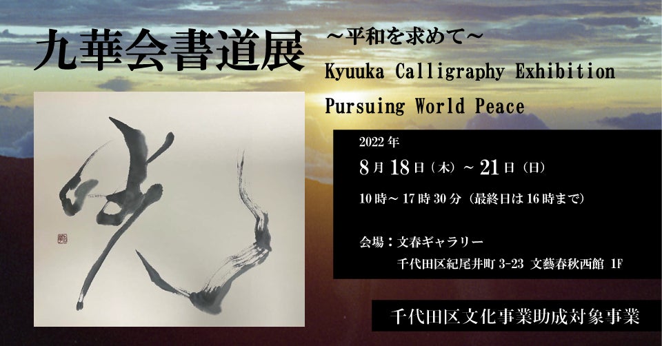 文部科学省認可公益財団法人日本書道教育学会支局 九華会書道教室(東京都千代田区隼町2-12)は、令和4年度 千代田区文化事業助成対象事業として、2022年8月18日(水)~21日(日)に、文春ギャラリー(千代田区紀尾井町3-23 文藝春秋西館 1F)において、「九華会書道展~平和を求めて~」を開催いたします。