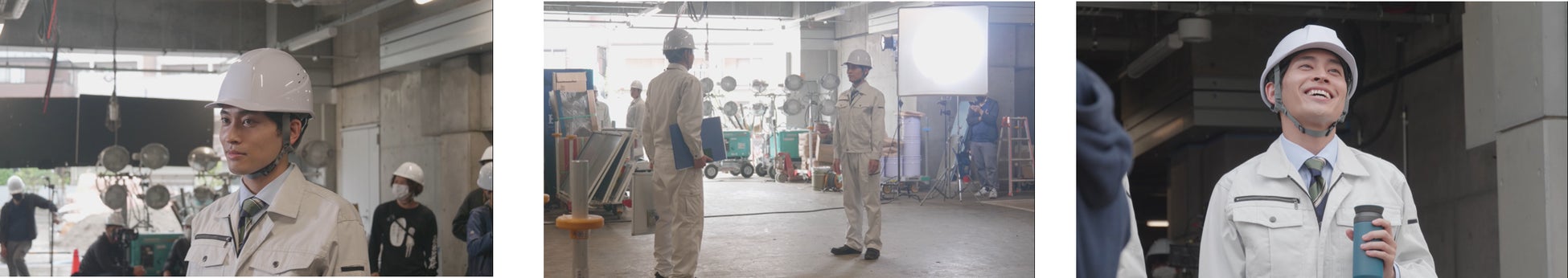 ドラマチックに光が差した建設現場。たくさんの荷物を抱えフル装備のベテラン上司と、平埜さんが演じる作業着を着用しただけの身軽な新人が向き合います。「そんな手ぶらじゃ、何もできないだろ~!」と感情的になるベテラン上司を前に、どこからともなくタブレット取り出し「できますよ!」と一言。CMの最後には二人揃って”eポーズ”を決めます。