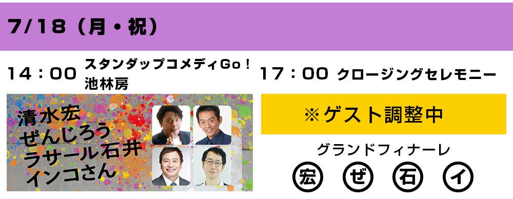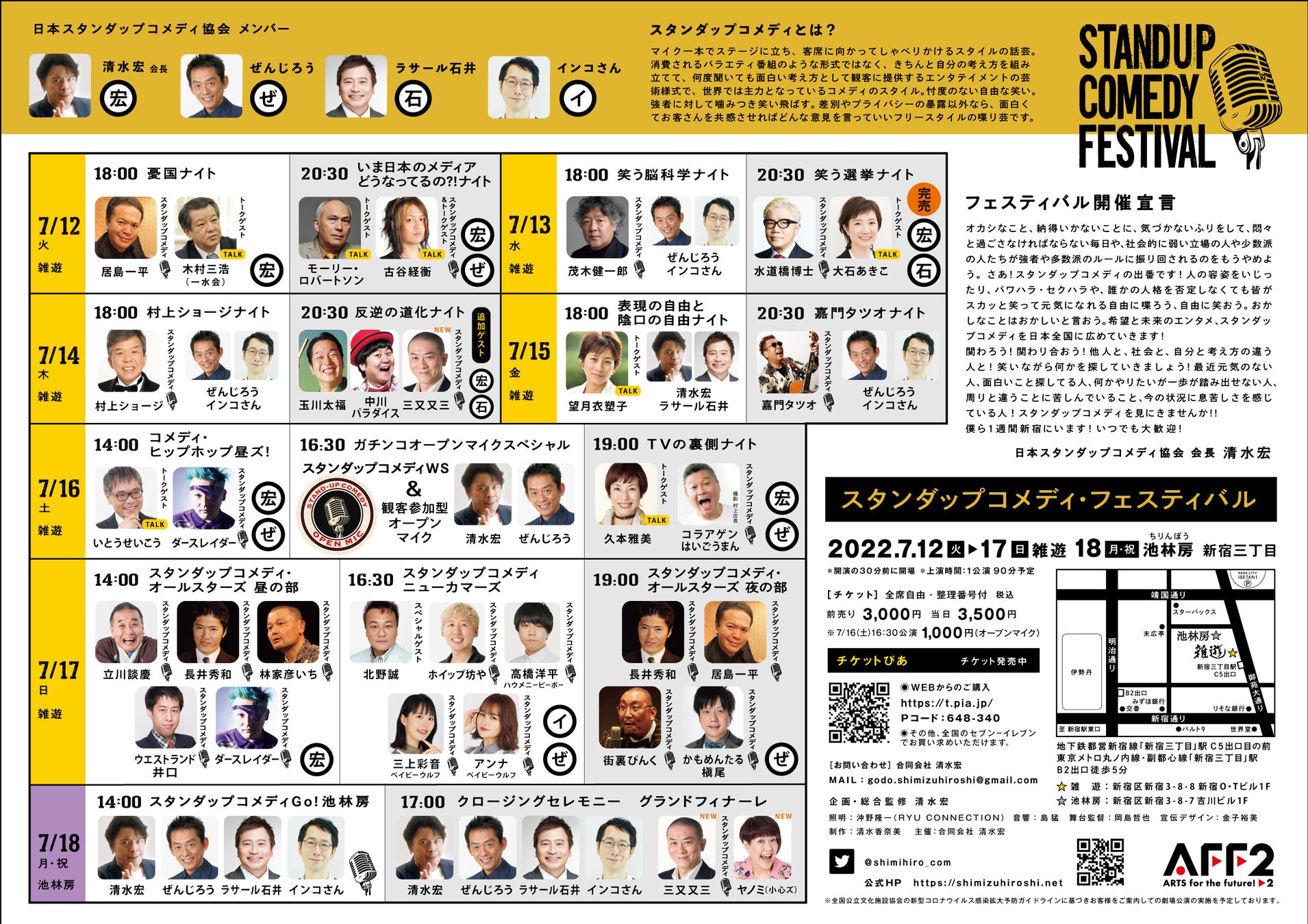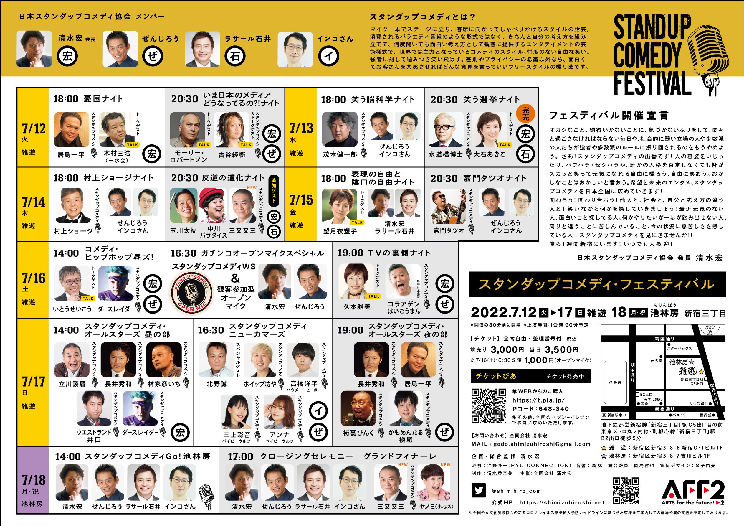 出演が決まっているのは、日本スタンダップコメディ協会のメンバー、清水宏、ぜんじろう、ラサール石井、インコさんの4人に加え、